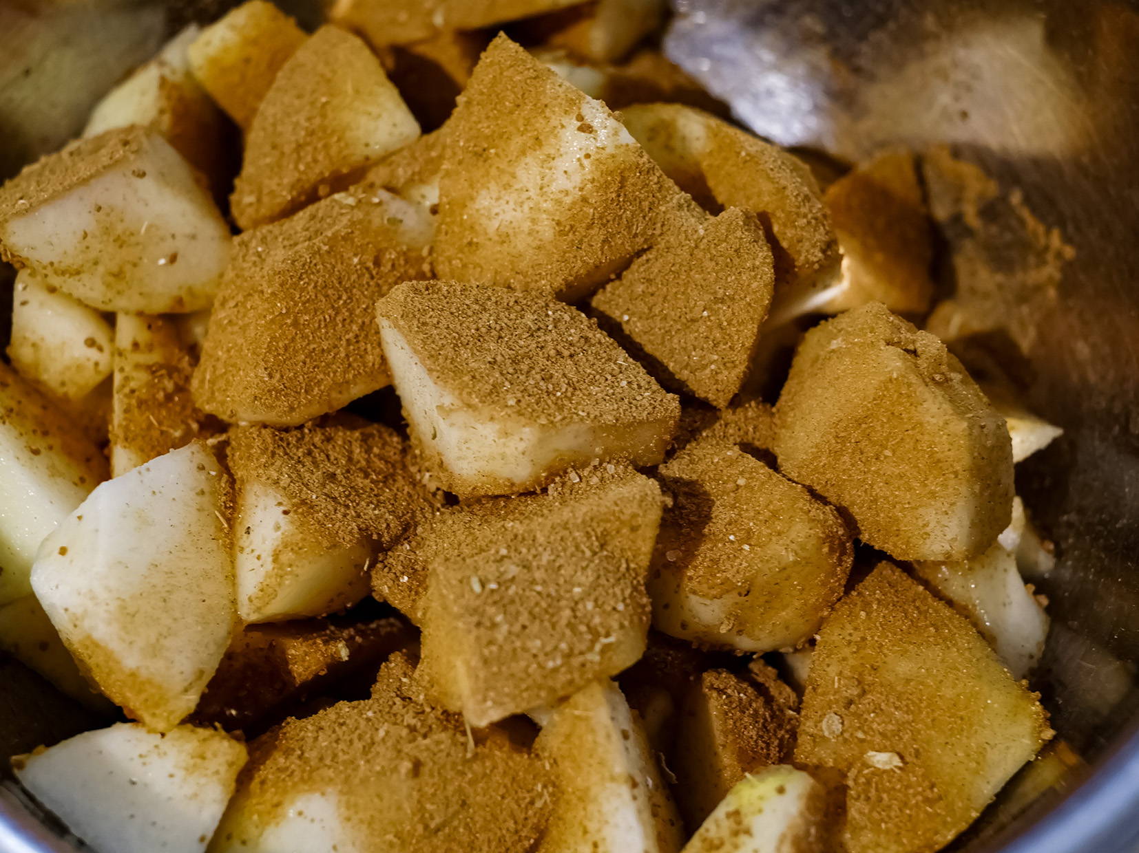 - ②ボウルにチャイシュガーを入れ混ぜ、洋ナシを加えて全体にまぶす。
