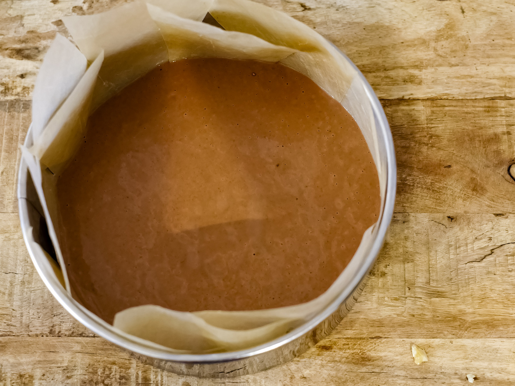 - ⑨170℃のオーブン中段で70〜80分焼く。粉が少ないのでトロリとなりますが、生焼けはふせぎたいのでじっくり焼きます。30分経過したらアルミホイルをかぶせ、表面が焦げるのを防ぎます。真ん中に竹串を刺してチェック。生地がほとんどつかなければ完成です。