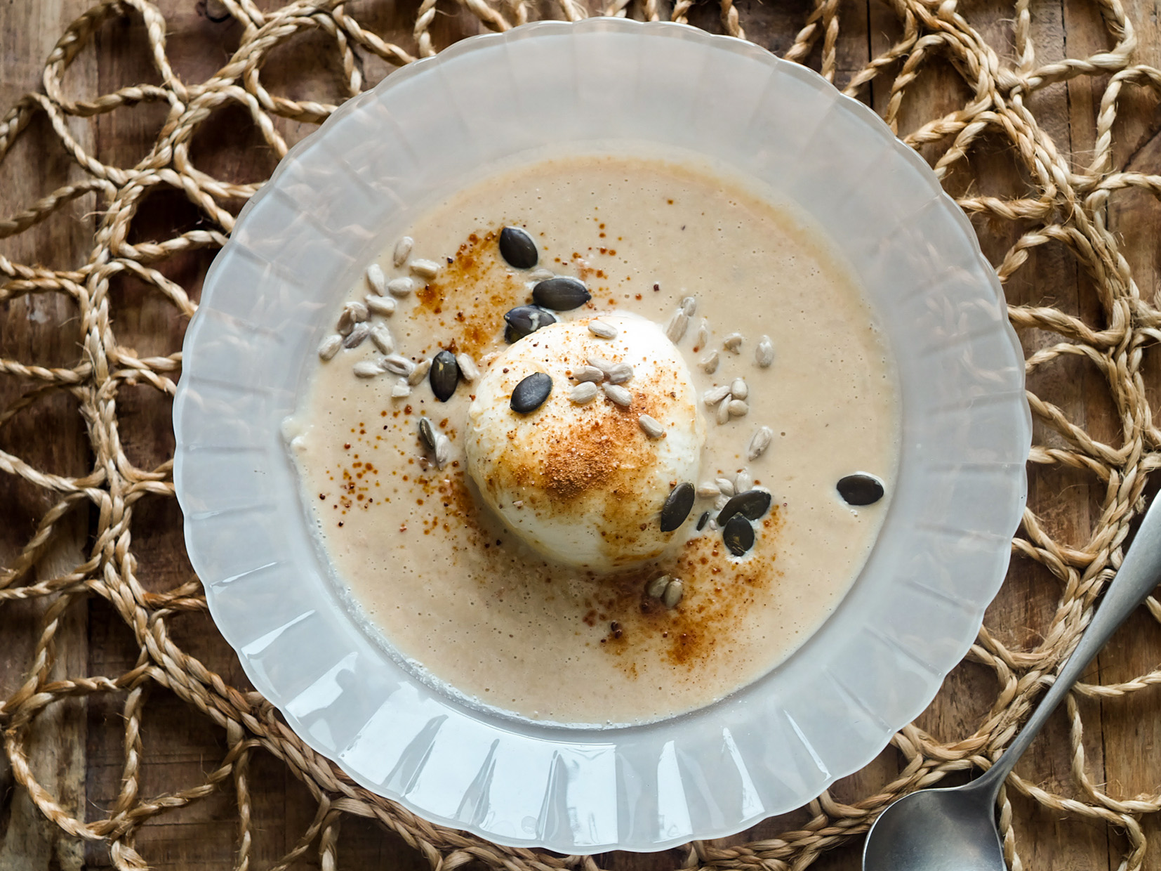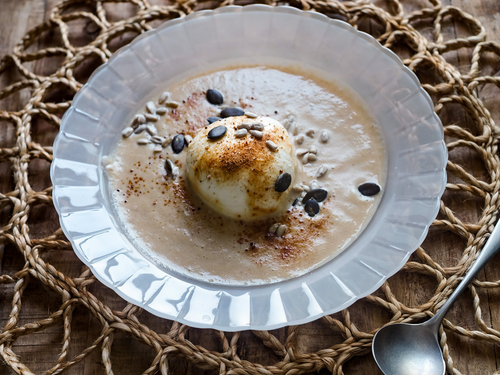 やさしい甘さのデザートのようなスープです。茹で栗の自然な甘みに、身体にやさしい甘味と岩塩、ミルクを合わせ、とろりと仕上げました。ほんの少しの岩塩が、甘さをいっそう引き立てます。
