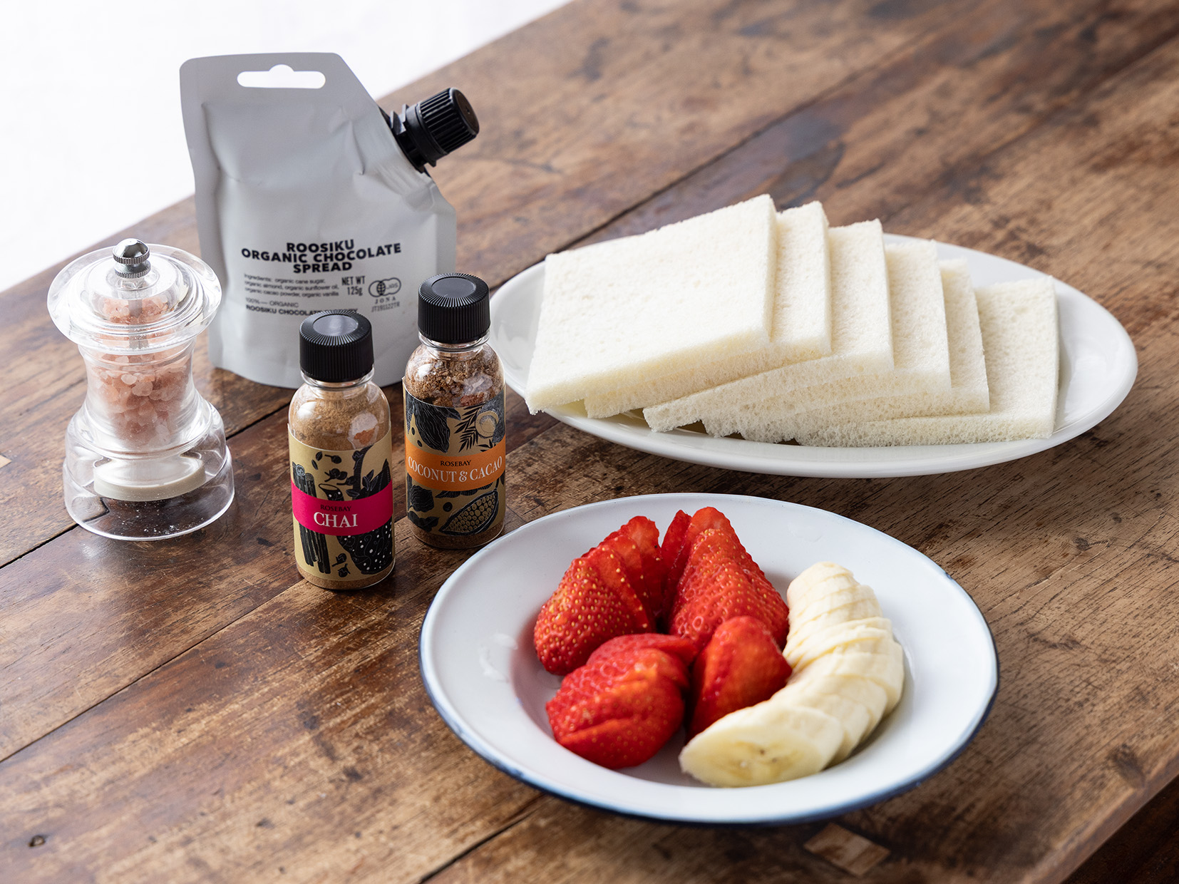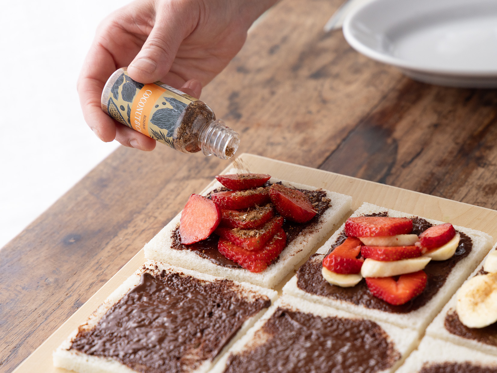 - 2.パン1枚1枚にチョコレートペーストを小さじ1づつ塗る。片方のパンにスライスしたフルーツを並べコーラルソルト、ココナッツ・カカオシュガーをお好みの量を振りもう一枚のパンで挟む。手のひらで全体を軽くプレスしてフルーツとパンを馴染ませ、お好みの形にカットする。