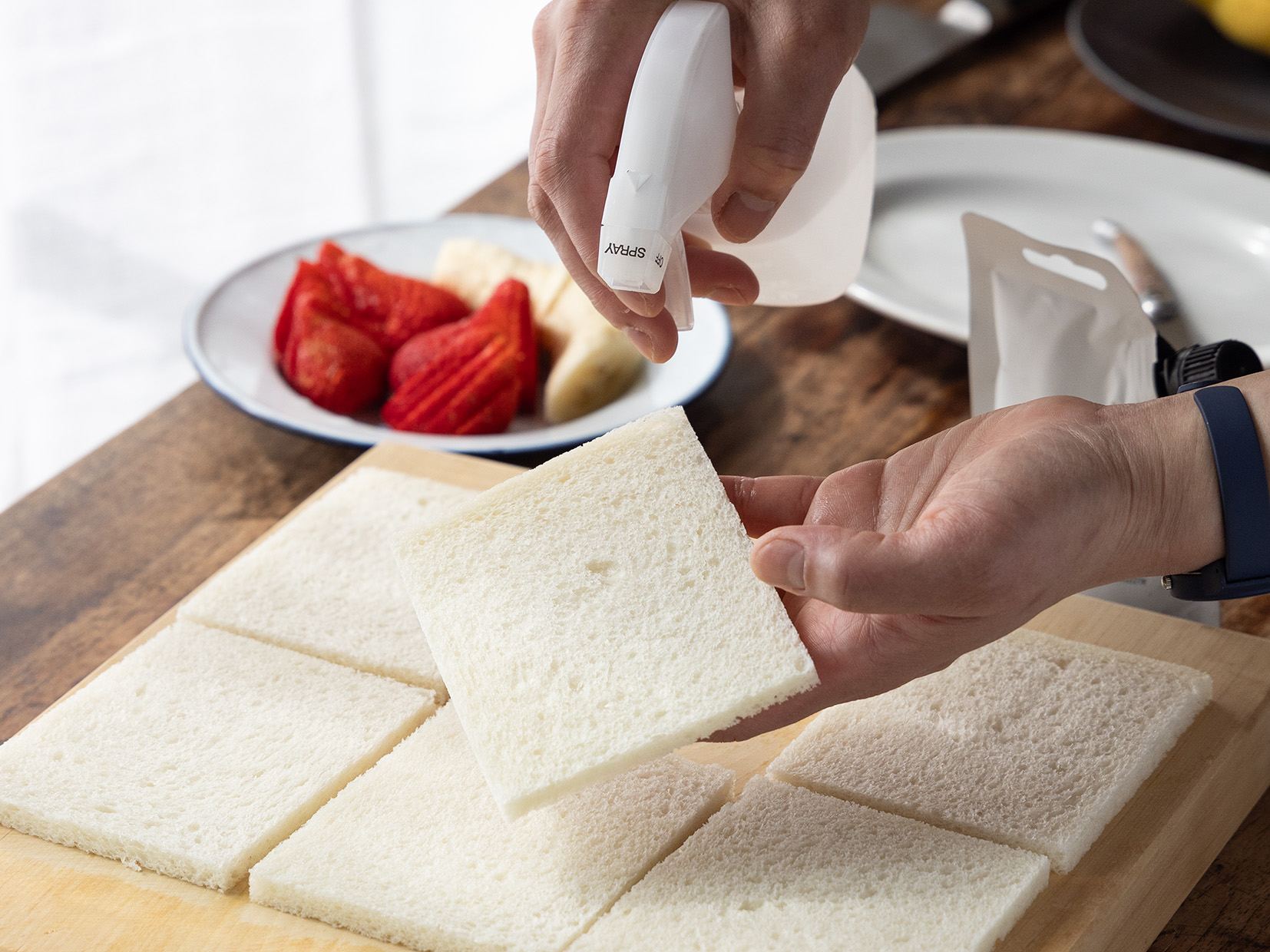 - 1.サンドイッチ用のパン全体に霧吹きで水をごく少量かけ軽く湿らせる。(霧吹きがない場合はハケを使ってパンを軽く湿らせる)