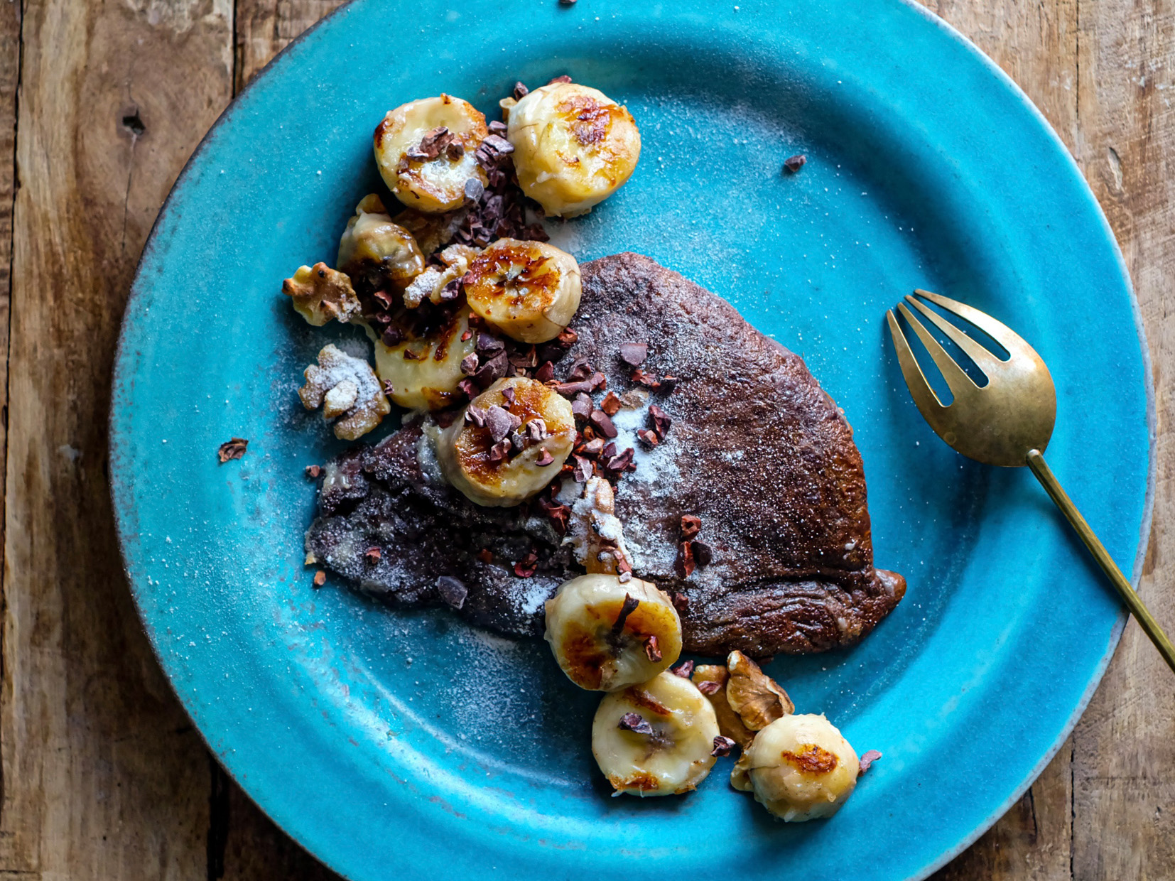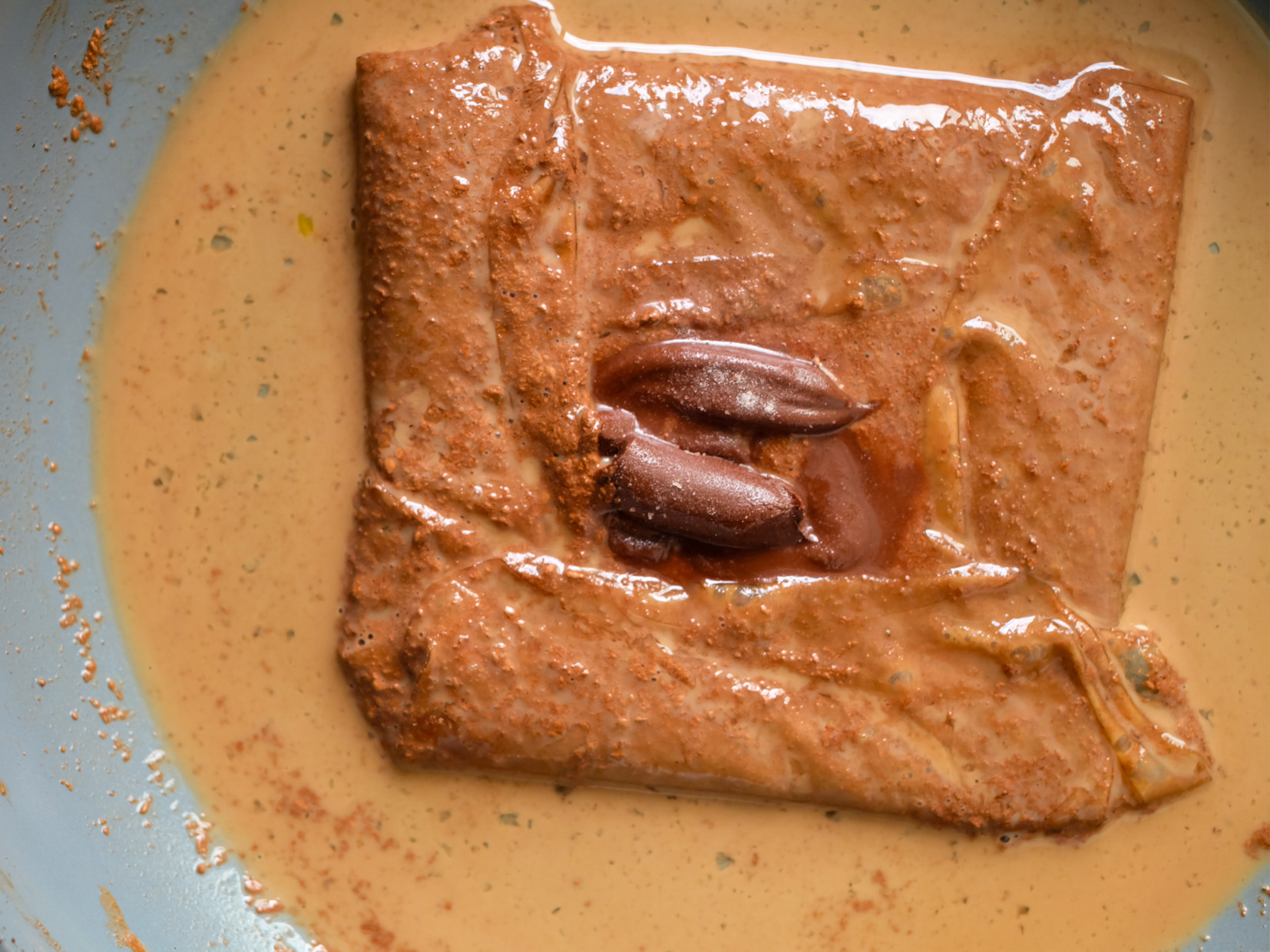外はパリッと香ばしく、中はとろけるチョコ。ライスペーパーを卵液(アパレイユ)にくぐらせて焼くことで、健康的ながら驚くほどパイのような食感に仕上がります。仕上げの岩塩が、控えめな甘さをぐっと引き立てます。